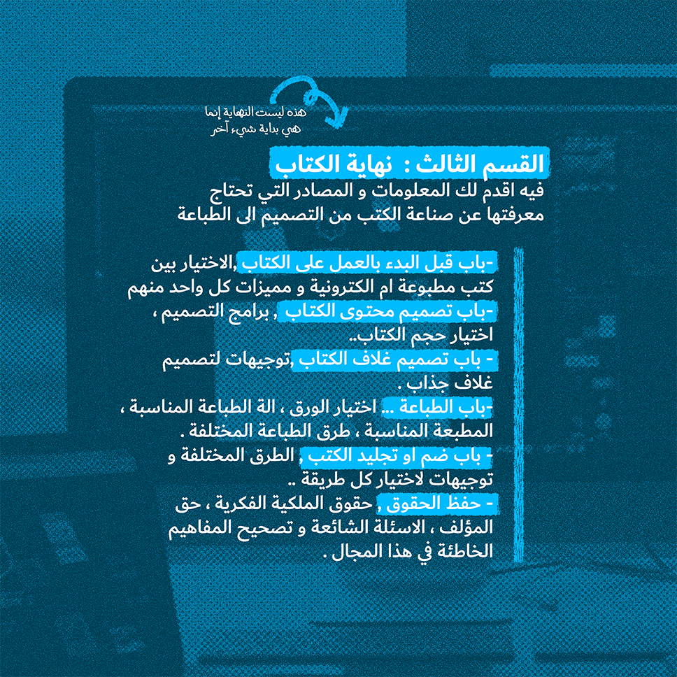 فيه آخذك إلى أعماق كل مراحل عمل الكتب من تصميم محتوى الكتاب حتى طباعته و إيجاد ناشر له !!