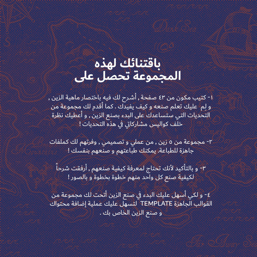 كتيب تعريفي : مكون من 42 صفحة يحتوي شرح عن الزين و ماهيته , و تحدي ليساعدك على البدء بخوض مغامرة صنع الزين ! بالإضافة إلى تجاربي الشخصية في صناعته